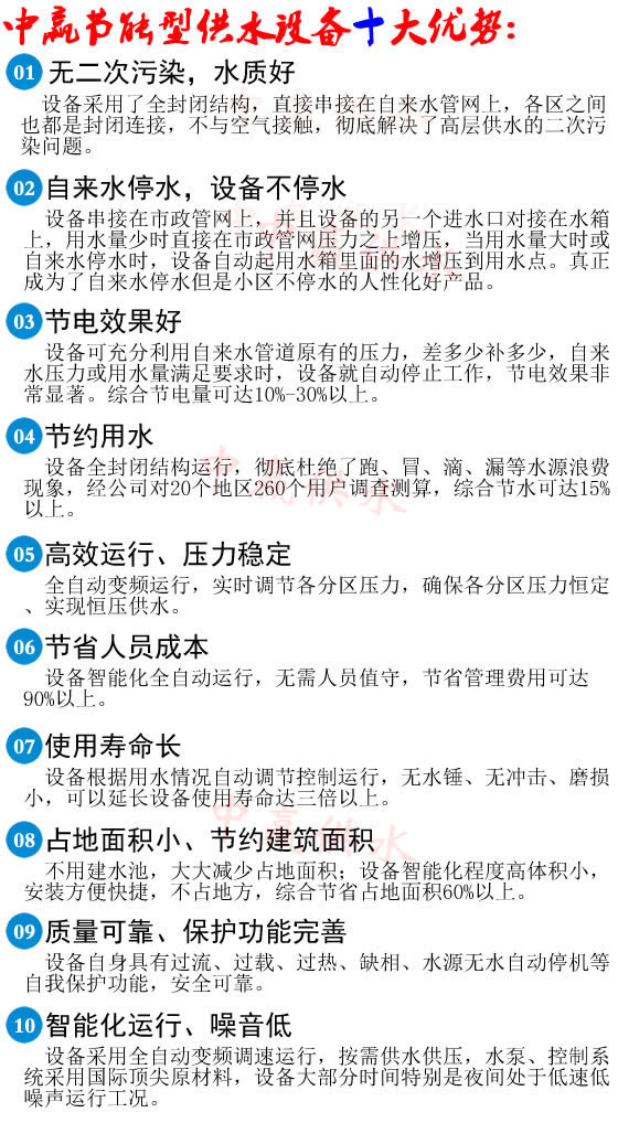 2、 充分利用了自來水管網原有壓力,降低了一次性投資,節電達50%-90%以上。